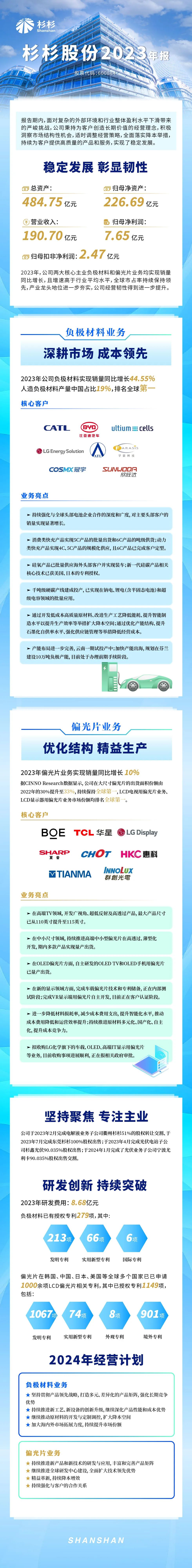 一圖讀懂杉杉股份2023年報 2024年04月25日 報告期內,面對復雜的外部環境和行業整體盈利水平下滑帶來的嚴峻挑戰,公司秉持為客戶創造長期價值的經營理念,積極洞察市場結構性機會,適時調整經營策略,全面落實降本舉措,持續為客戶提供高質量的產品和服務,實現了穩定發展。