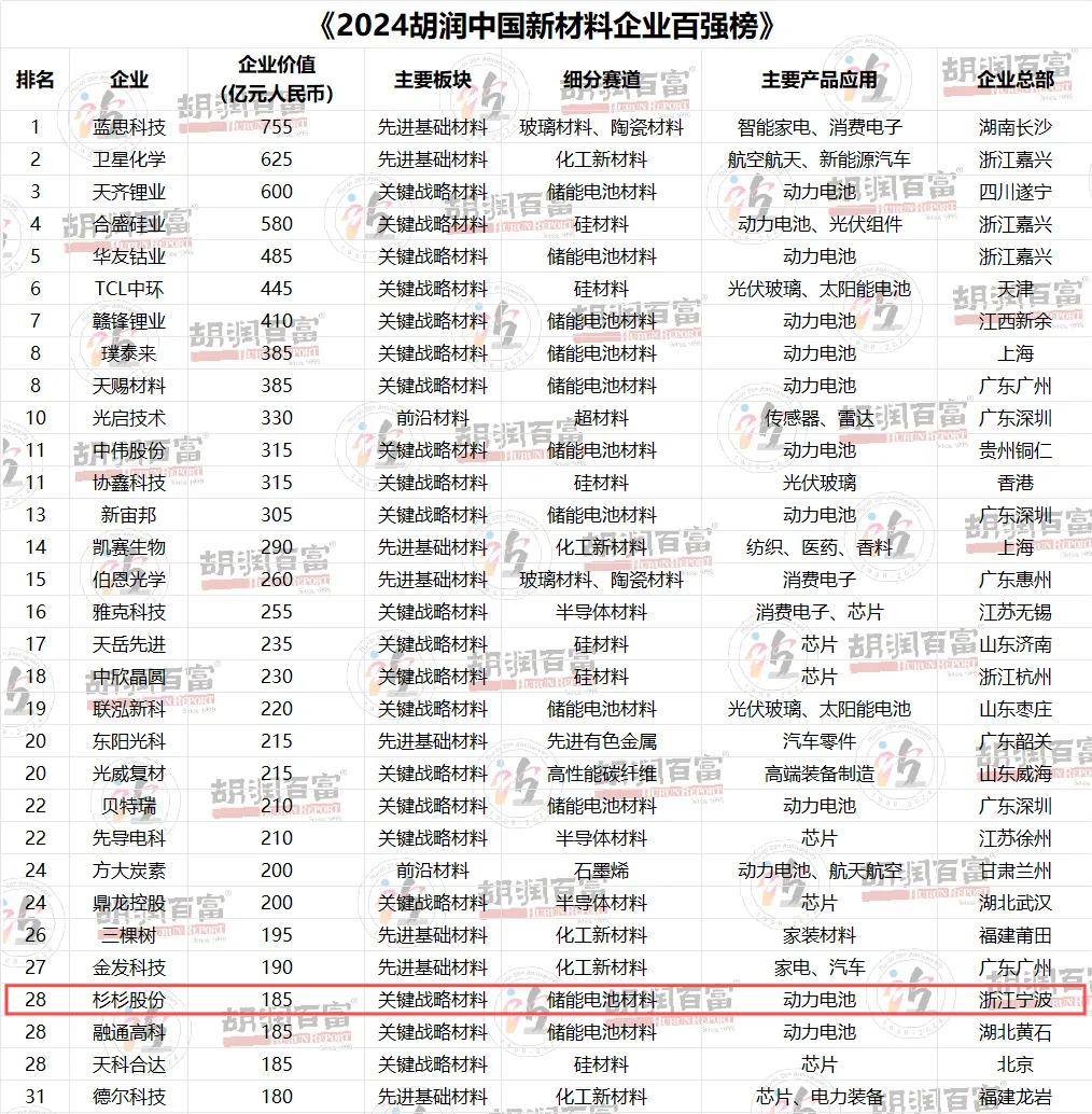 7月26日,胡潤研究院發(fā)布《2024胡潤中國新材料企業(yè)百強(qiáng)榜》及《2024胡潤中國新能源潛力企業(yè)百強(qiáng)榜》。杉杉股份以第28位登上《2024胡潤中國新材料企業(yè)百強(qiáng)榜》,杉杉鋰電以第9位登上《2024胡潤中國新能源潛力企業(yè)百強(qiáng)榜》。
